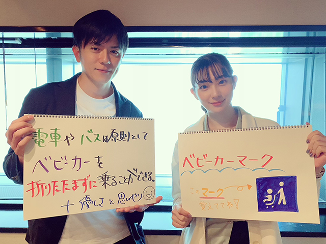 「電車やバスは原則としてベビーカーを折りたたまずに乗ることができる。+優しさと思いやり」「ベビーカーマーク このマーク覚えててね!」