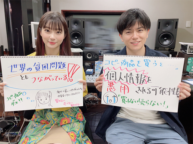 「世界の貧困問題ともつながっている!! コピー商品ダメ!! 海外の貧しい地域の人々を低賃金でやとってるんだって… 買わない 売らない 買わせない」「コピー商品を買うと…。個人情報を悪用される可能性も。『買わない! 売らない!』」