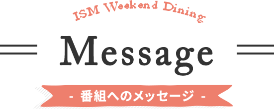 リスナーの皆さんからのメッセージを募集します。テーマは「がんばる日のレシピ、がんばらない日のごはん」例えば・・・「今日はがんばって、ビーフストロガノフを作ってみました!」「今日のごはんは、時間がなかったので買ったお惣菜のハンバーグで済ませました。 でも、大根おろしは自分でたっぷり作ってアレンジしました!」など、 番組ウェブサイトからからお送りください。