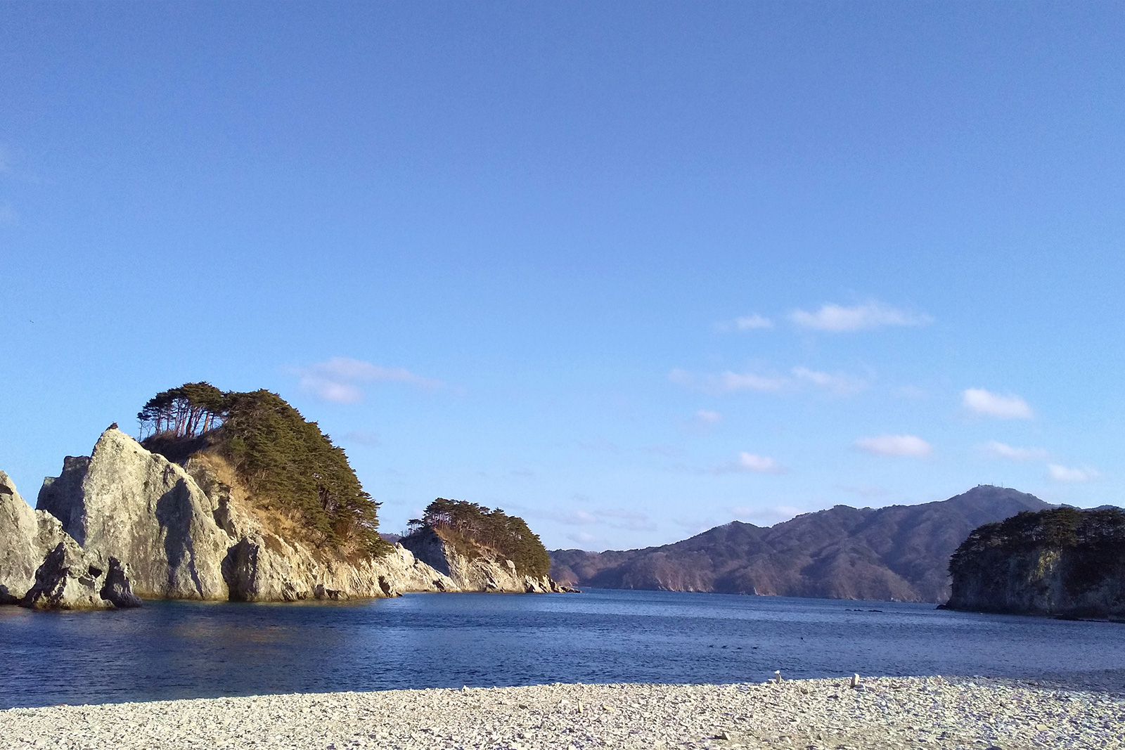乳白色の岩が連なり、穏やかな波が白い小石の浜に寄せる様は名前の通り極楽浄土を思わせる神秘的な美しさ。