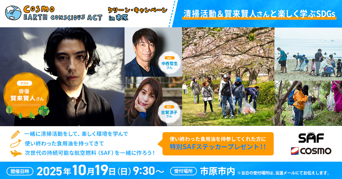 清掃活動の後には、コスモの次世代航空燃料「SAF」のTVCMでもお馴染みの賀来賢人さんも参加し、トークショーを実施!実際に廃食用油の回収も当日行いますので、ご家庭で使用した食用油もお持ちください。