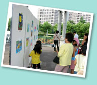 事前に募集した「Kids絵画コンクール」作品展示にも、家族連れを中心に見学者が多く、自身の描いた絵の前で記念写真を撮る幼稚園児の家族の姿が多く見受けられました。 |