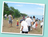 会場となったのは、猪苗代湖畔 天神浜。参加者をグループに分け、それぞれのグループにNPOの方をリーダーとして活動をしました。 |