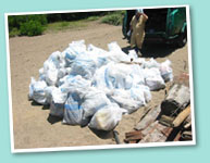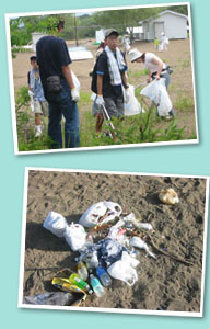 ゴミは、砂浜はビン、カン、ペットボトル等の飲料や、タバコ、花火の残骸が中心でした。人目のつかない草むらには、オートキャンプ利用者、湖水浴客が不法投棄したと思われるゴミが散在していました。 |