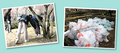 梅林公園一帯を3班(梅林公園、遊歩道2箇所)に分かれて清掃。ゴミはタバコの吸殻や瓶、缶、ペットボトル、その他飲食用のプラスチック容器などが中心。 |