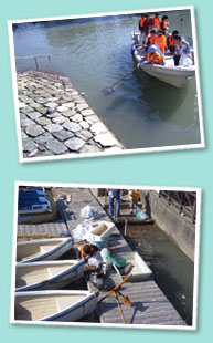 缶、瓶、ペットボトルやタバコの吸殻、食べ物の包装などのゴミが多く、新町川にはプラスティック、発砲スチロールなども浮遊してました。河川のゴミはボートを1隻出してを網で掬いながら回収をしました。普段は拾えないゴミを回収できて参加者の人たちも楽しんでいました。 |