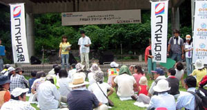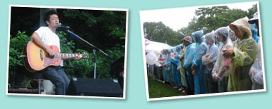 清掃活動後には、河口恭吾さんライブが開催され、残った参加者は最後まで熱心に河口さんの歌声を鑑賞していました。MCでは、環境についての話を織り込んだり、予定外のアンコール曲を1曲演奏するなど、大盛況に終わりました。 |