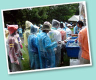 清掃活動を開始してから10分ほどでにわか雨が降り始めたが、突然の雨にもかかわらず、参加者は雨ガッパを着て活動をしてくださいました! |