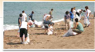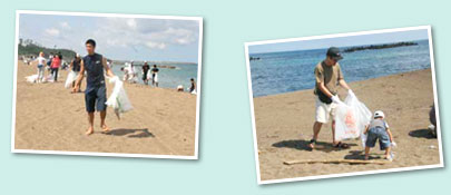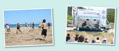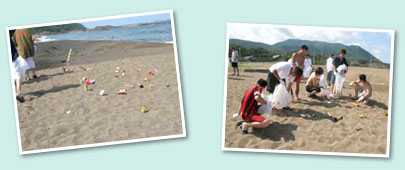 綺麗になった海岸でのお楽しみはビーチドッジボール大会!白熱した戦いの合間には兄弟ユニット、キセルの二人が、夏の海をバックに素敵な夏の歌を聞かせてくれました。 |