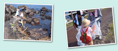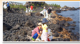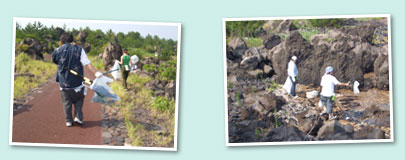 溶岩で不安定な足場でしたが、「クリーンアップかごしま事務局」の方々のご協力もあり、その指導、誘導のおかげで、参加者にはケガも無く、清掃活動が出来ました。 |