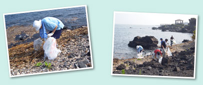 | フェリーに乗って、鹿児島県の名所、桜島にある溶岩なぎさ公園へ。海岸に沿った公園を巡り、夏の日差しと潮風を受けながらの清掃活動でした。 |