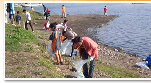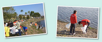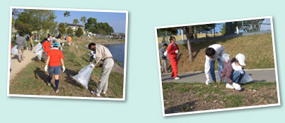 江津湖周辺と動植物園周辺とに分かれて、清掃していきました。熊本動植物園には珍獣クスクスなど珍しい動物も多く飼われていて、思わず子供達も見とれてしまうことも。ビニールゴミやペットボトルなどを回収。 |