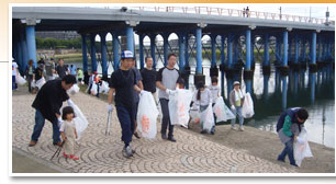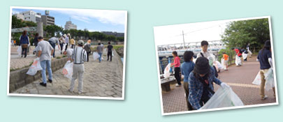 | 雨の予報が出て当日の天気が心配されましたが、見事に快晴。岡山市旭川の京橋に集合し、京橋河岸一帯の清掃活動に取り組みました。 |