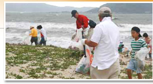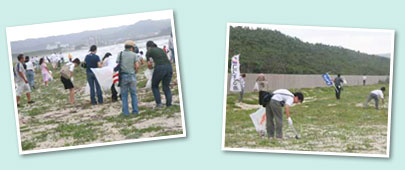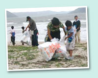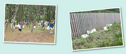 | 今回は佐賀でも観光名所として知られる唐津市の虹の松原が会場です。二手に分かれて、広い松林の中、そして海岸沿いと清掃していきました。 |