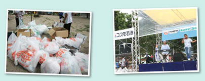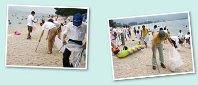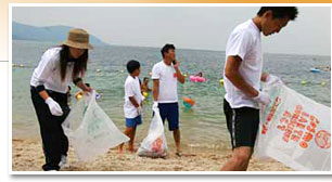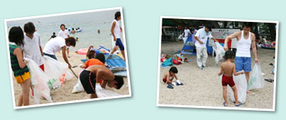 | びわ湖の美しい眺めが楽しめる近江舞子の中浜ビーチに集合。ほどよく晴れた天気の中、遊びに来ていた湖水浴客の方たちにも呼びかけると、続々と参加してくれました。 |
