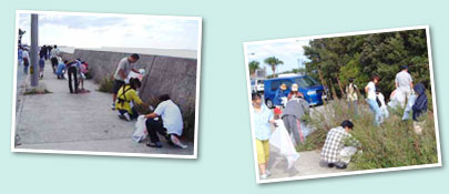 植え込みの中にもたくさんのゴミが散乱!駐車場の溝や防波堤の隅まで、細かいゴミも見逃さないようにゴミを集めます。