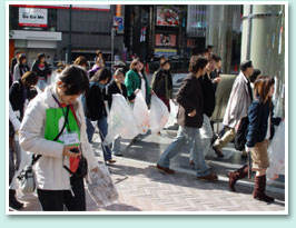 参加者の皆にとって、普段は遊びに来るだけで、見過ごしがちな街のゴミ。それを見つけ、清掃していくことで、渋谷は自分たちの渋谷であり、自分たちが綺麗にするんだ、という意識も自然と高まりました。 |