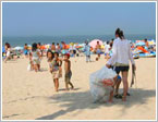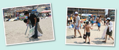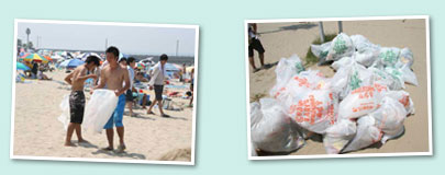 朝から海水浴客で賑わう中での清掃は大変でしたが、目につく限りのゴミを出来る限り回収していきました。 |