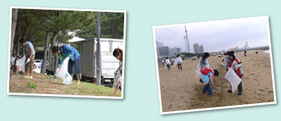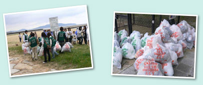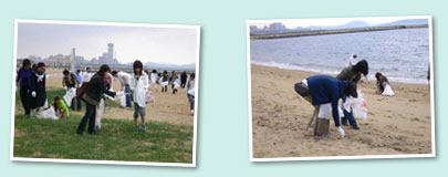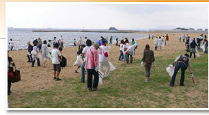 | 今年の清掃場所は地行浜海浜公園の地行浜ビーチ。ホークスタウンやドームもすぐ近くにあって、人の出入りも多いところです。夏のシーズンを迎える前に、清掃して綺麗な浜辺を目指します。 |