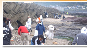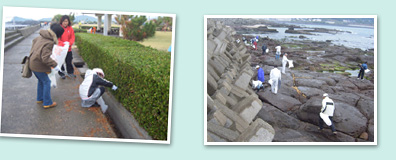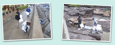 あいにくの雨模様でしたが、雨ガッパを着用するなどして、頑張って清掃活動スタートです。大人は岩場や堤防、子供達は公園周辺と二手に分かれて回収していきました。 |