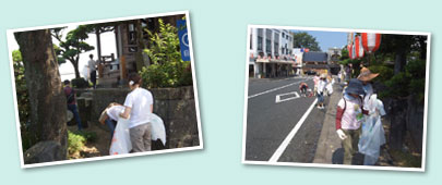 市内にある大宮神社境内から一帯を手分けして清掃していきます。山鹿市では、8月15日と16日は、熊本を代表するお祭りの一つである「山鹿灯籠まつり」が開催されています。熊本県内のみならず、全国から、外国からもたくさんの人が山鹿市を訪れる祭りです。 |