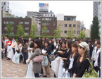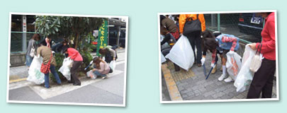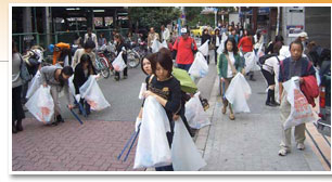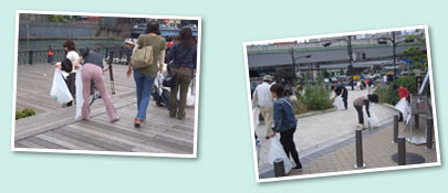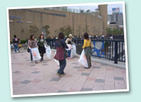 港町リバープレイスは大阪でも有数の若者の街、アメリカ村に隣接しています。リバープレイスから出発し、アメリカ村など市街の清掃に取り組みました。 |