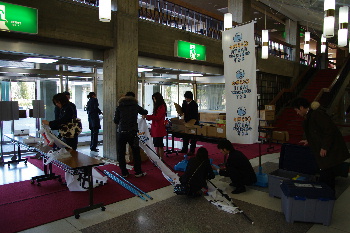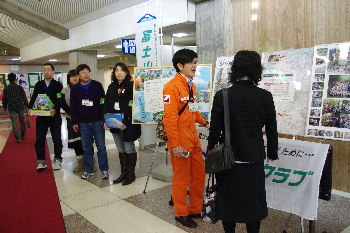11:50来場されるお客様が増えてきたのと、外の寒さが身にしみるため開場の時間を繰り上げました。富士山クラブの展示ブースの前では人が集まっていました。募金箱を手にしているのは、富士山クラブの会員の皆さま。
