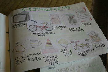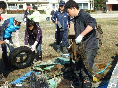 立野川で集めたゴミを校庭の片隅に集めこれから分別作業に移る。
