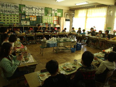 給食です。小学生と一緒に食べる給食楽しそう。4年2組の教室で