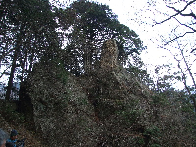 天狗岩を降り向かいの山道からこの天狗岩を見上げると、この岩が天狗岩と言われる由来が、中央の高く延びる岩が天狗の鼻に見え、斜め上を見上げている天狗に見えるためこの名がついたとのこと(天狗に見えますか?)