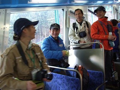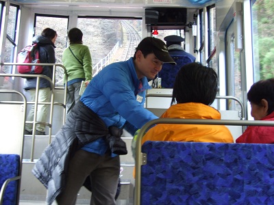 下りのケーブルカーの中でも広報活動に努めます。