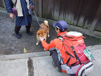 散歩中の犬と戯れる。