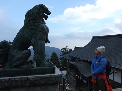 御嶽神社前の狛犬を見上げる野口さん。
