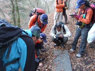 登山道を歩くとところどころにテンの糞が、この糞のある場所をGPSで計測。さらに何を食べ手いるのかを確認。確認をしているのは都レンジャーの三好さん。それをみんなで見守る。