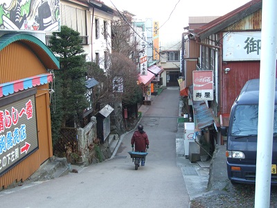 神社前の階段下まで戻ってきました。お土産物屋さんが立ち並ぶ。この御岳山独特の時間の流れを感じた。