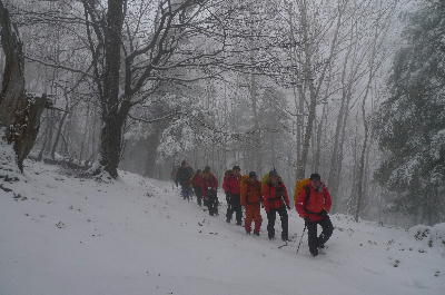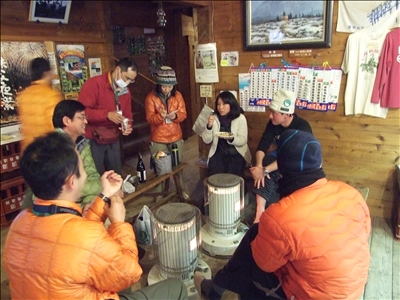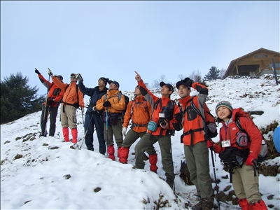 雲取山では、朝から雨でしたが途中雪に変わり、ところどころで顔を出す鹿達を見ながらも、鹿によって木の皮が食べられてしまっている状況や、雪に残ったウサギ等の足跡をGPSで計測し記録を残したり、台風の直後には各登山道をボランティアと共に調査し、倒木や落石などによる封鎖された場所を調査し復興させたりと活躍されています。彼らが活動する傍ら、自然に対しての知識を多く教えていただけました。知らなかったことを知る、本当にいい機会に恵まれと思う。