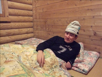 部屋でくつろぐ野口氏