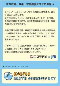 コスモ石油と、ジャパンエフエムネットワークでは、この活動を広報する目的で、音声収録ならびに、映像・写真の撮影をさせていただきます。皆様の顔・容姿などを撮影した映像・写真、ならびに収録した声・インタビューの音声は、今後ラジオ番組・ラジオCM・テレビCM・ホームページなどにおいて、広く活用・公開させていただく場合がございます。つきましては、撮影や収録にご都合が悪い方は、あらかじめ運営スタッフまでご相談・お申し付けください。みなさまの理解とご協力をお願いいたします。