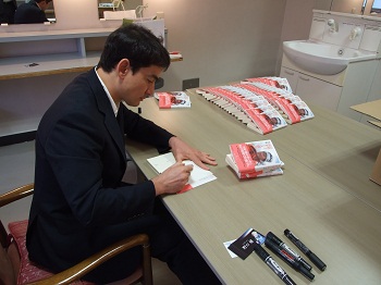 岡山市民会館に到着するも、すぐにサインを始める野口さん。