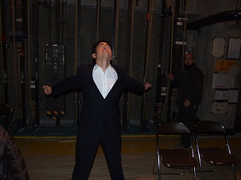 講演前のステージ脇で伸びをする。