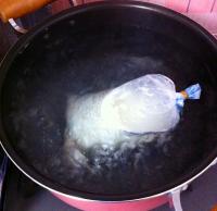 袋の口をしっかり輪ゴムで留めて、お湯で30分ほどゆでます。