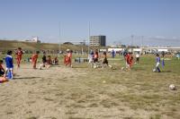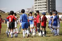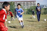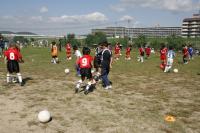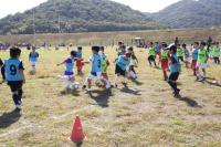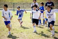 広〜いサッカー場の中で、たくさんの子どもたちが一生懸命にボールをけっています。