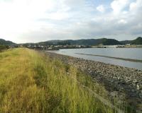 かさおか太陽の広場の海岸はやや高めの土手を超える必要があります。