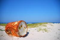 白い砂浜とオイルの缶(漂流物にしては、かなり浜を上がったところに…)