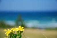 白い砂浜と角島 小さな黄色い花が潮風に揺れています