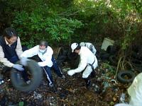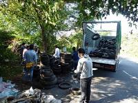 こういう場所ではバケツリレーが一番効率が良いですね。がけの上では高松市環境部さんが手配してくれた中古タイヤリサイクル専門のトラックが待ちかまえ、手当たり次第放り込みました。