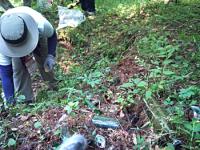 昨年初めてここで清掃活動をしましたが、あまりの不法投棄の多さに、予定時間内には全く目処がつかず、参加したメンバーが全員、何か後ろ髪を引かれるような思いで後にした因縁の場所・・・今年はそのリベンジ!と入ったところでしょうか?今年、私たちが担当した場所は、道路脇の木立の中。一見、なんの変哲もない樹海の風景に見えましたが、その土にスコップを入れたとき響いた音はカチャン・パキンというガラスの音・・・
