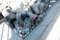 Dブロックとは、上の写真の遠くに見える「島」のような岩の向こう側です。ここにはテトラポットが置かれているため漂着ごみが引っかかって残ってしまったり、なによりここから先はしばらく民家がないため「不法投棄」の格好の現場になっているのです。