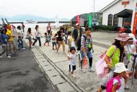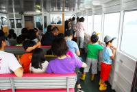 第二便の船の中は、時間もいいので、皆さん目も冷めているのか、元気な子供が多そうです。最近は岡山や大阪に渡るのも橋をわたってしまうので、フェリーに乗って外を眺めるのは、子供たちにとっては物珍しい風景だったのではないでしょうか?