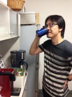 弊社給湯室でコーヒーを飲むメイク前の西川アナ